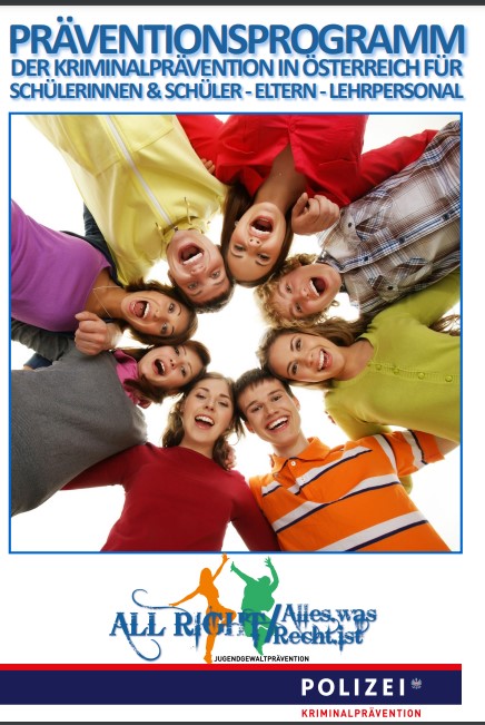 Das Gewaltpräventionsprogramm „ All Right – Alles was Recht ist!“ (siehe bundeskriminalamt.at) befasst sich mit der präventiven Rechtsinformation, im Speziellen mit dem Verwaltungs-, Straf- und Zivilrecht, da Jugendliche in ihren unterschiedlichsten Lebenswelten mit verschiedenen gesetzlichen Bestimmungen konfrontiert werden. Darüber hinaus wird ein besonderes Augenmerk auf die Förderung des Bewusstseins für zivilcouragiertes Verhalten und die Erarbeitung von Handlungsstrategien in Bezug auf eine gewaltfreie Konfliktlösung gelegt. (Quelle: https://bundeskriminalamt.at/205/files/FlyerAllRight.pdf)